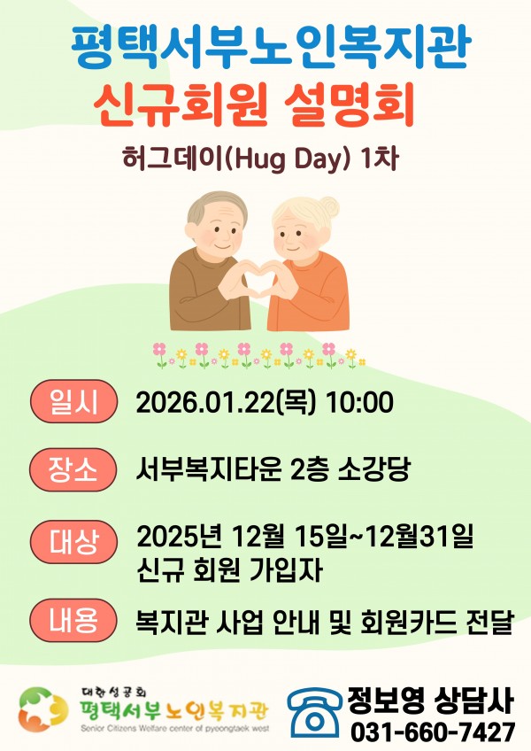공지 | 2026년 1차 신규회원 설명회 안내 페이지 정보 작성자 서부노인복지 작성일26-01-16 12:04 조회89회 댓글0건 관련링크 이전글 다음글 목록 본문 평택서부노인복지관에서 신규회원 가입자 분들께 안내드립니다.2025년 12월 가입자 분들에게 신규회원설명회를 진행합니다. 1월 22일 목요일 오전 10시, 평택서부복지타운 2층 소강당에서 진행할 에정이니 많은 관심과 참여 부탁드립니다. ^^ 댓글목록 등록된 댓글이 없습니다. 이전글 다음글 목록