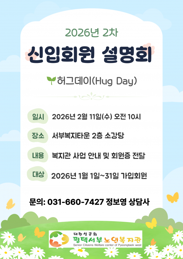 공지 | 2026년 2차 신입회원 설명회 안내 페이지 정보 작성자 서부노인복지 작성일26-02-05 10:13 조회871회 댓글0건 관련링크 이전글 다음글 목록 본문 안녕하세요~ 평택서부노인복지관에서 2026년 2차 신입회원 설명회를 하오니 많이 참여해 주셔서 더 유익한 복지관 생활을 하시길 바랍니다^^ 댓글목록 등록된 댓글이 없습니다. 이전글 다음글 목록