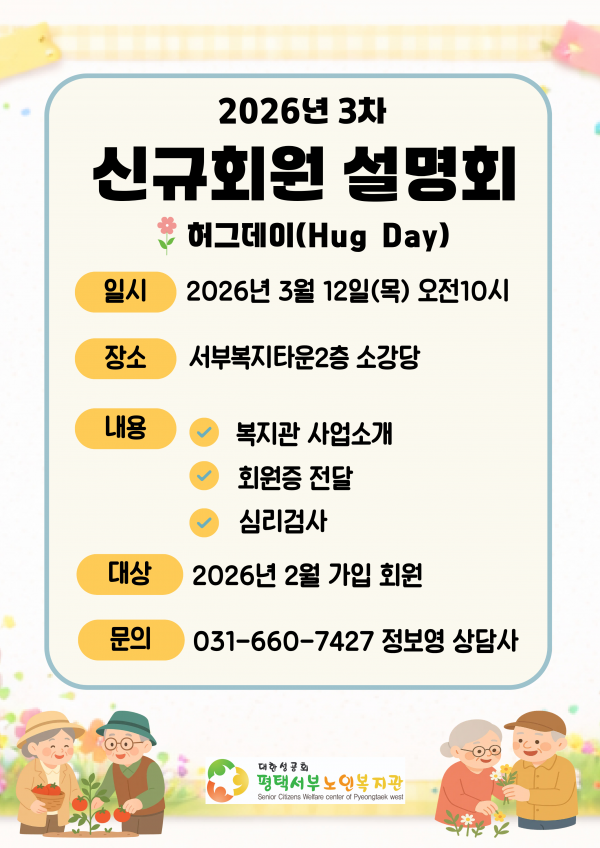 공지 | 2026년 3차 신규회원 설명회 안내 페이지 정보 작성자 서부노인복지 작성일26-03-05 18:23 조회186회 댓글0건 관련링크 이전글 다음글 목록 본문 안녕하세요? 평택서부노인복지관에서 2026년 제 3차 신규회원 설명회 합니다. 2월에 회원가입 하신 분들은 꼭 참석해주세요^^ 댓글목록 등록된 댓글이 없습니다. 이전글 다음글 목록