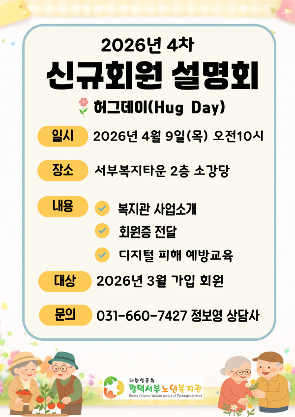 공지 | 2026년 제4차 신입회원설명회 안내 페이지 정보 작성자 서부노인복지 작성일26-04-01 15:49 조회409회 댓글0건 관련링크 이전글 다음글 목록 본문 평택서부노인복지관 제 4차 신입회원설명회 안내드립니다. 모두 참석하셔서 더 즐거운 복지관 생활로 행복해지세요^^ 댓글목록 등록된 댓글이 없습니다. 이전글 다음글 목록