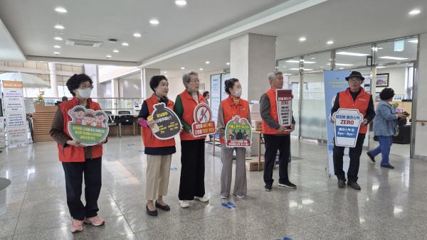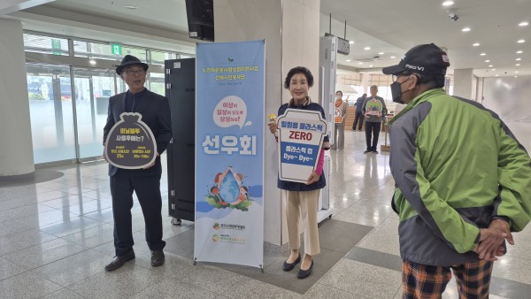 2026 노인자원봉사활성화지원사업 선배시민 선우회는 4.17.(금) 9시부터 1시간 동안 복지타운 이용자 대상으로 일회용품 사용 줄이기 캠페인을 진행하였습니다.