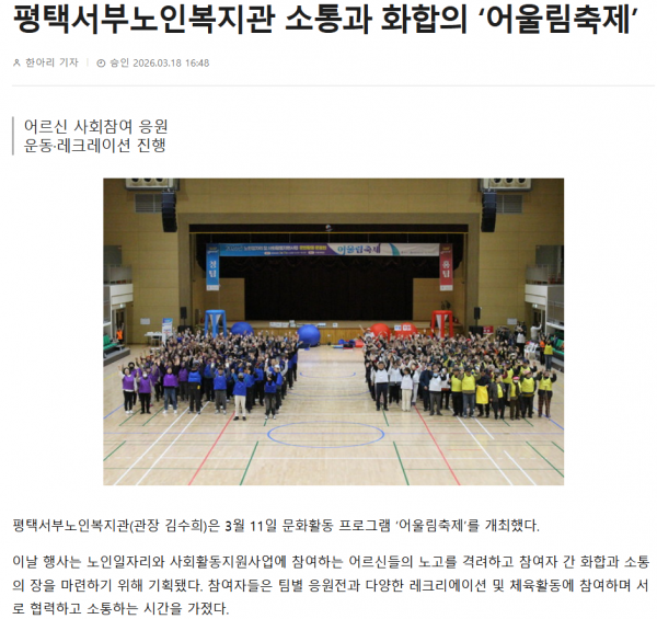 2026년 노인일자리 및 사회활동지원사업 참여자 문화활동 운동회 '어울림축제' 성료 페이지 정보 작성자 서부노인복지 작성일26-03-19 17:00 조회285회 댓글0건 관련링크 다음글 목록 본문 [르포] 멈췄던 청춘의 시계가 다시 돌다 < 지역소식 < 기사본문 - 주간평택https://www.pttimes.com/news/articleView.html?idxno=78281 평택시민신문 댓글목록 등록된 댓글이 없습니다. 다음글 목록